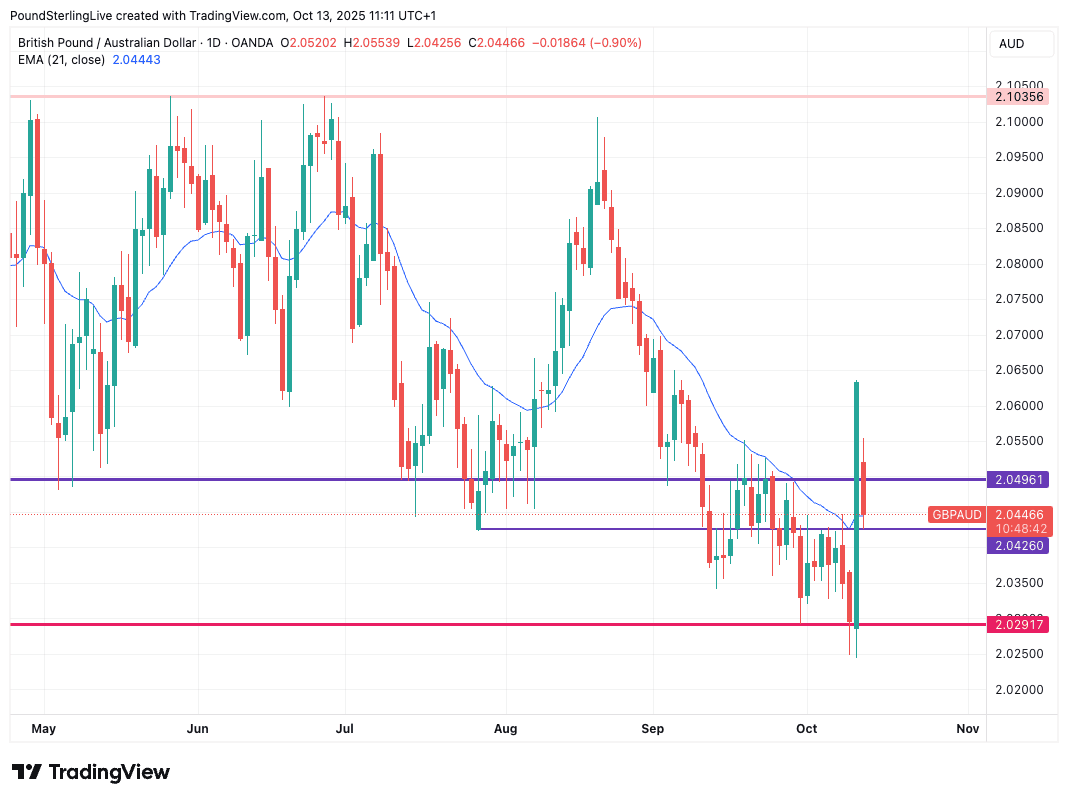 The subsequent rally lifts GBP/AUD off the floor and back above the 21-day exponential moving average at 2.0444, which must be defended if the GBP/AUD is to turn the trend from downward to upward.