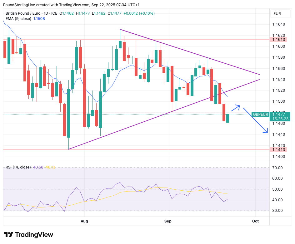 The selloff takes the GBP/EUR below its nine-day exponential moving average (EMA), confirming the downside is preferred in the coming five days.