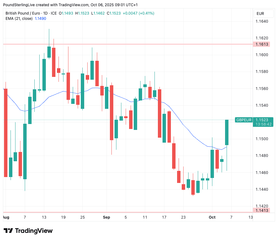 The pound to euro exchange rate (GBP/EUR) starts the new week with a solid 0.36% gain, hitting 1.1521, which is the highest level since September 18.