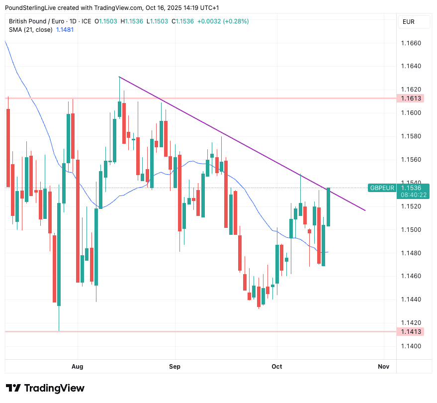 Dispensing with the clichéd idioms, GBP/EUR has on Thursday risen into a descending trend line, which the pair has not been able to close above since August 14.