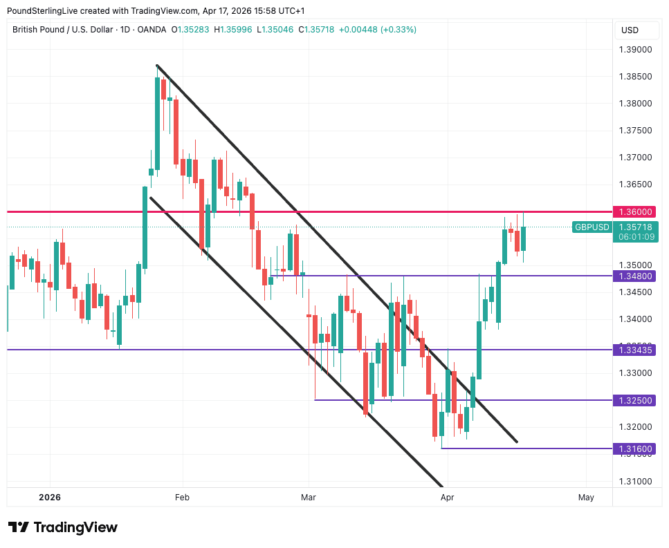 GBP/USD surged through the first half of April as hopes for a reopening of the Strait grew, rising from 1.3160 to the cusp of 1.36 by the middle of this week, where it met resistance and fell back, having failed to advance through here on three occasions.