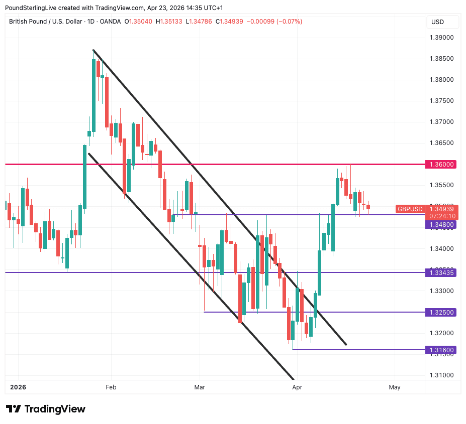 A rising dollar pushes the GBP/USD exchange rate back to support at 1.3480 and analysts we follow think there's further weakness ahead owing to limited visibility on the Middle East conflict.