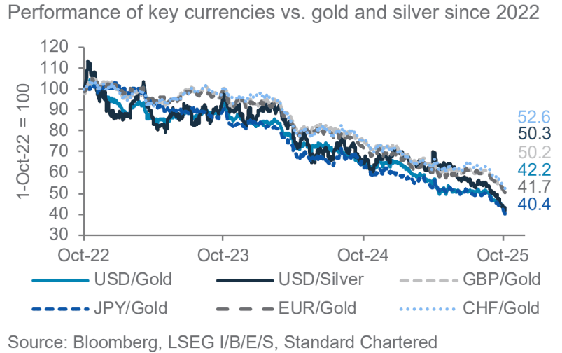 Standard Chartered explains this reflects renewed concerns about fiat currencies due to the increasing dominance of fiscal policy across Developed Markets.